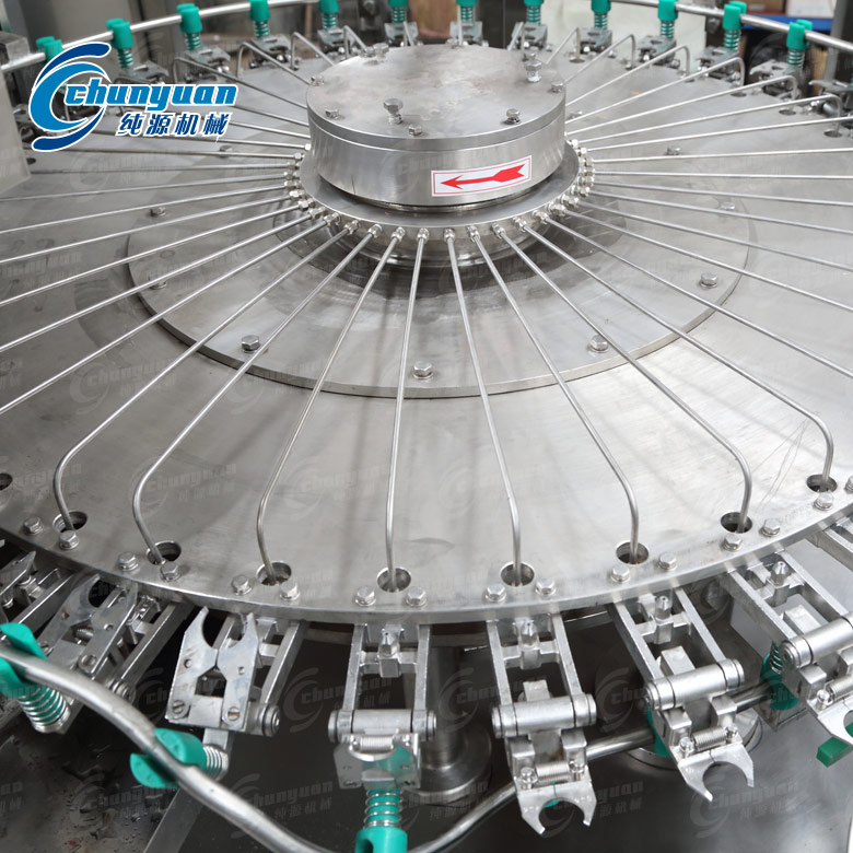 瓶子由通过风送道传递,然后通过拨瓶星轮传送至三合一机的冲瓶机。冲瓶机回转盘上装有瓶夹,瓶夹夹住瓶口沿一导轨翻转180°,使瓶口向下。在冲瓶机特定区域,冲瓶夹喷嘴喷出冲瓶水,对瓶子内壁进行冲洗。瓶子经冲洗、沥干后在瓶夹夹持下沿导轨再翻转180°,使瓶口向上。洗净后的瓶子通过拨瓶星轮由冲瓶机导出并传送至纯净水灌装设备。
