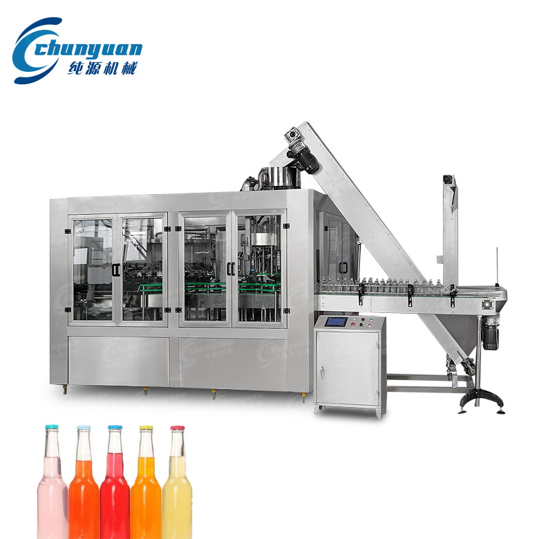玻璃瓶果汁饮料灌装机集冲洗、灌装、旋盖三功能于一体,是纯源机械厂家以国外先进技术为基础,根据果汁、茶等饮品的灌装工艺要求研制而成的。玻璃瓶果汁饮料灌装机设计科学合理、外形美观、功能齐全、操作维修方便,自动化程度高,是中小型饮料生产厂家的理想设备。