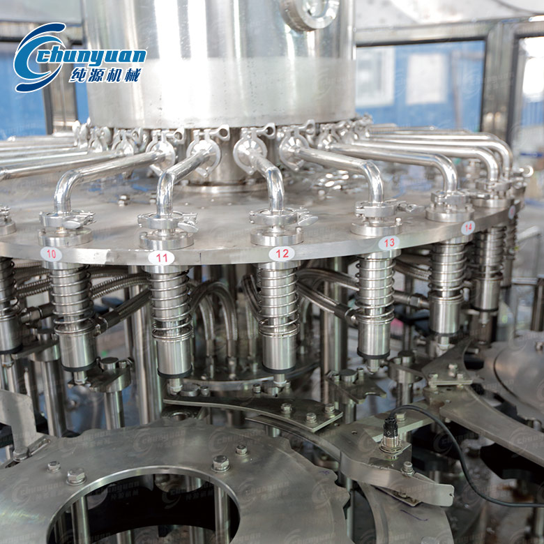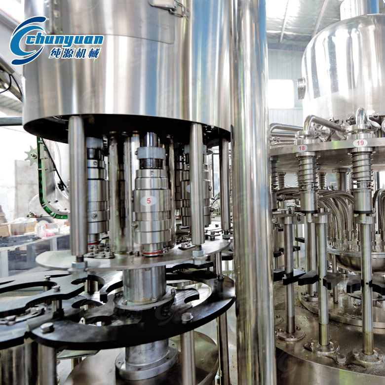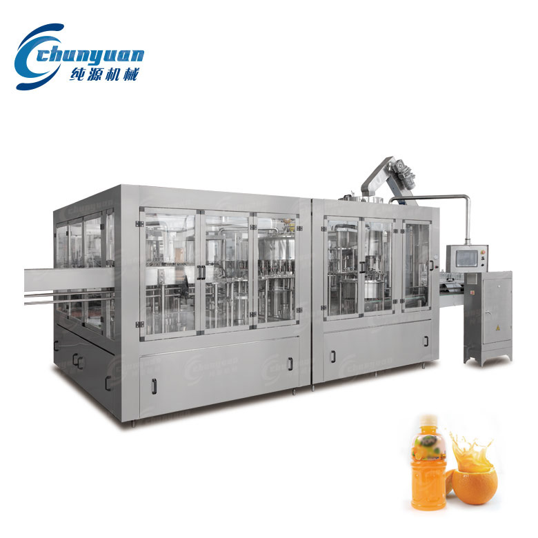 纯源机械厂家供应的果蔬汁饮料机械集洗瓶、灌装、封盖于一体,适用于各种果汁、茶饮料的灌装。
